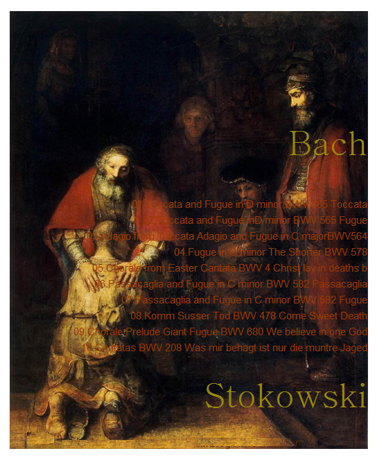 02. Toccata and Fugue d minor BWV565 Fugue 03. Toccata Adagio and Fugue C major BWV564 Adagio 04. Fugue g minor The Shorter BWV578 05. Chorale from Easter Cantata BWV4 06. Passacaglia and Fugue c minor BWV582 Passacaglia 07. Passacaglia and Fugue c minor BWV582 Fugue 08. Komm Susser Tod BWV478 (Come Sweet Death) 09. Chorale - Prelude Giant Fugue BWV680 (We believe in one God)